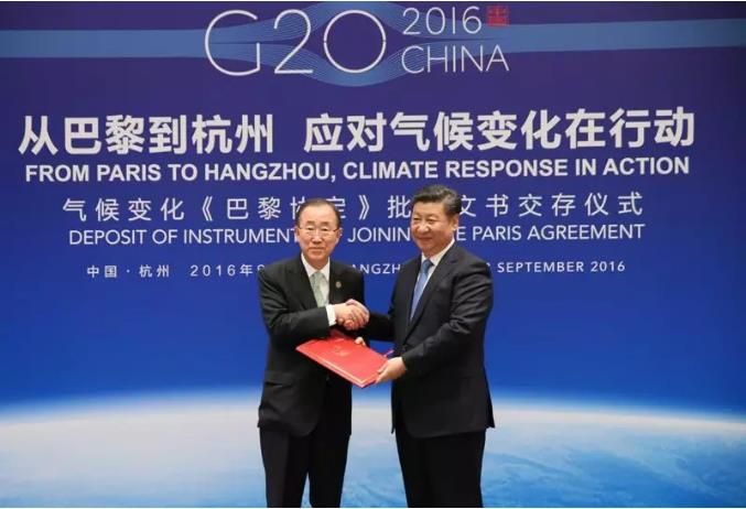 △2016年,習(xí)近平向潘基文交存中國(guó)氣候變化《巴黎協(xié)定》批準(zhǔn)文書。